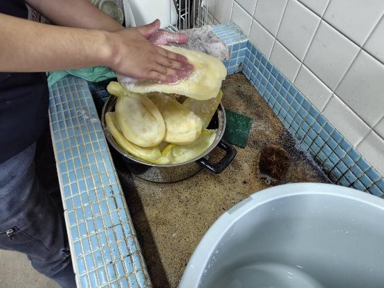 白瓜の塩漬け作業では、うまく水が抜けなかったものをもう一度漬けなおしました。大量の塩をひたすら白瓜に擦り込んでいって、その後しばらく手から漬け物の匂いがしました。うまく水が抜けてくれるといいなと思います。