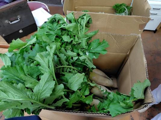 朝市が終わったら宇津塾前の畑で豚汁に使うサツマイモを約40本と、その他収穫できる野菜を収穫しました。雨の影響で足元がぬかるんでいて、土も重かったため収穫作業はいつもより疲れる作業になりました。