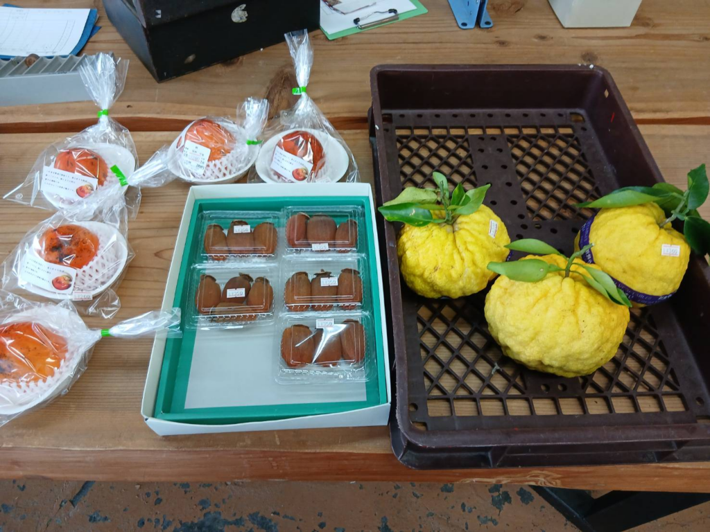 見たこともないような大きな柚子もありました。鬼柚子というものだそうですが、街中のスーパーマーケットには並ばないような品物に出会えるのも朝市の魅力です。どのようにして食べたらおいしいかとか、料理のコツなども、地域の方から直接教えてもらうことができます。