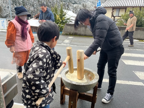朝市終了後、外で地域の方々と餅つきをしました。重い杵を振り上げる餅つきは、いい運動になりました。ついた餅は、あんこやきな粉、納豆を包んでいただきました。また、納豆を混ぜてからつく納豆餅にも挑戦しました。非常に美味しかったです。